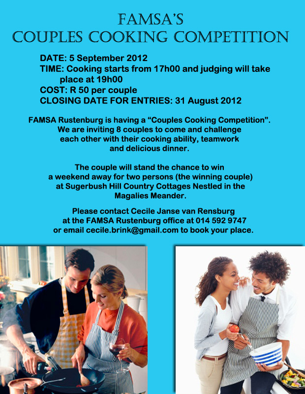 FAMSA Rustenburg is having a “Couples Cooking Competition”. We are inviting 8 couples to come and challenge each other with their cooking ability. With teamwork and delicious dinner, the couple will stand the chance to win a weekend away for two persons (the winning couple) at Sugerbush Hill Country Cottages Nestled in the Magalies Meander.